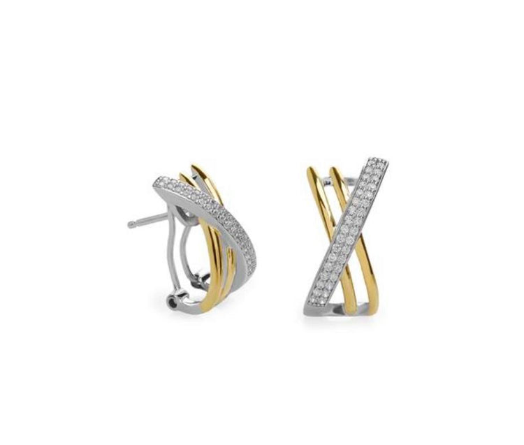 Pendientes de plata925 con baño de oro amarillo 18K. Con un brazo liso y le cruza otro cuajado en circonitas blancas. Sistema de cierre omega.
