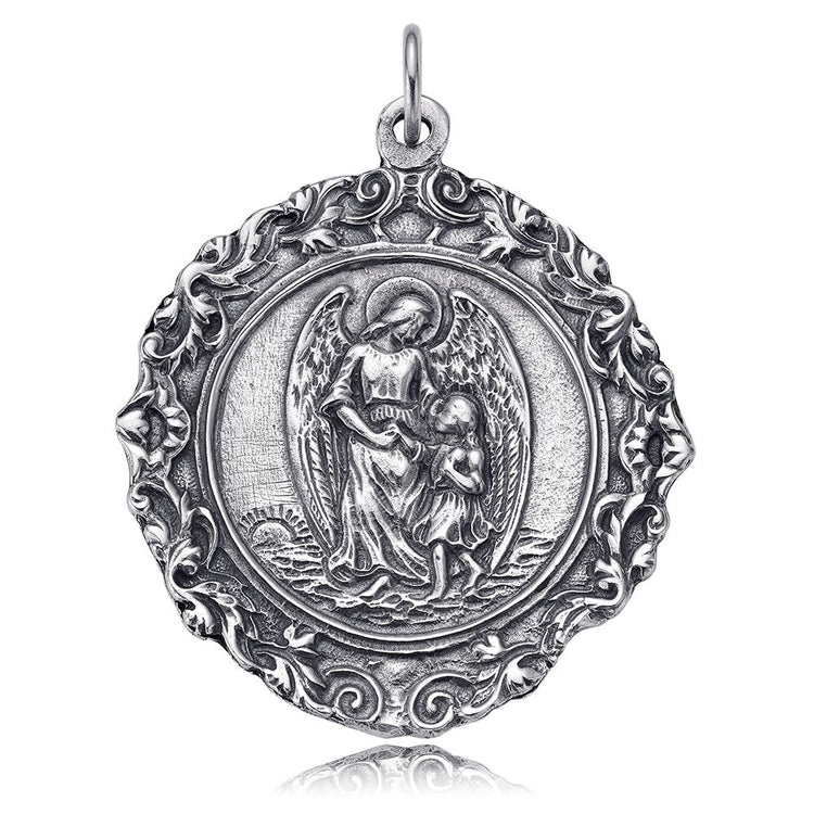 Medalla de cuna del Ángel de la guarda dando la mano a un niño. Realizada en plata de primera ley.