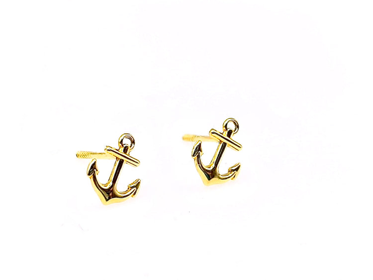 Pendientes de niña de oro amarillo de ancla náutica con rosca