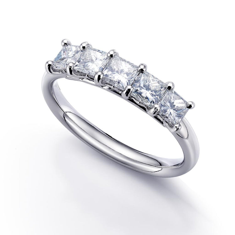Anillo de oro blanco de 3,816 g con corona de 5 diamantes talla princesa de 1,100 ct.