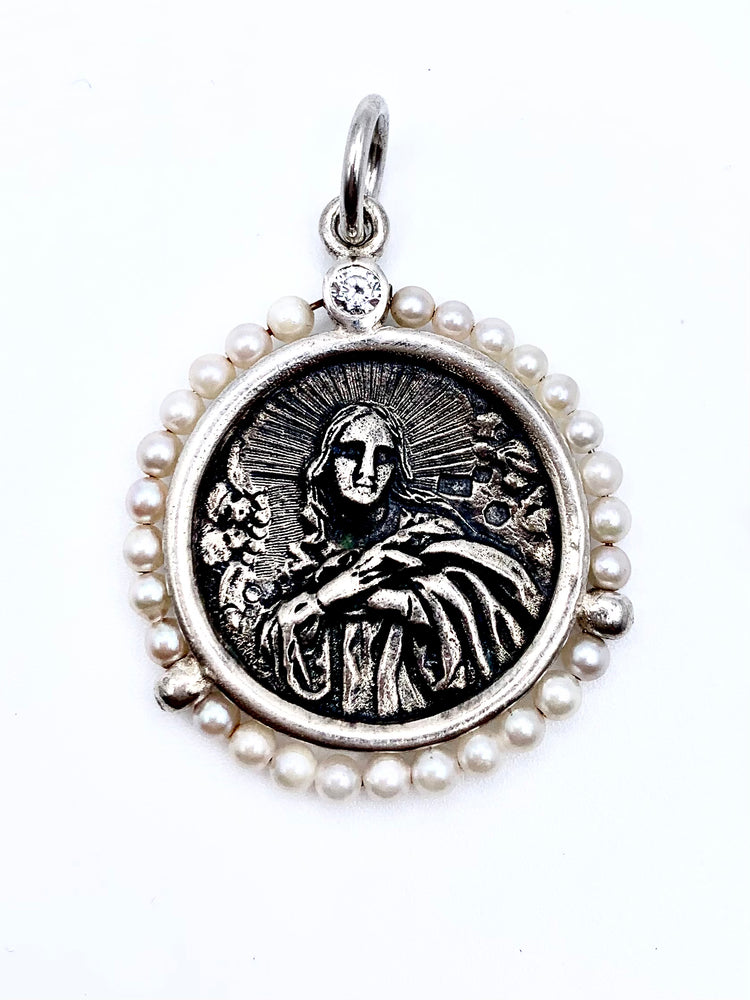 Medalla V. De la Inmaculada con cerco de perlas de río alrededor y circonita blanca. 3cm de diámetro.