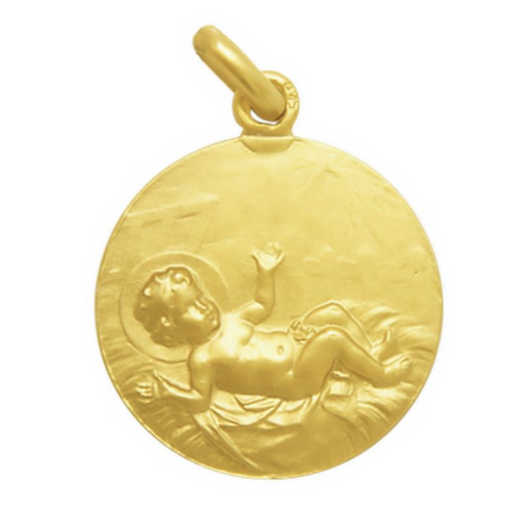 Medalla de oro maciza del Niño Jesús entre pajas. 25mm de alto x 19mm de ancho.
