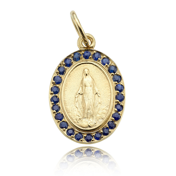 Medalla de oro amarillo y zafiros azules, con 0,73 ct., con imagen de la Vírgen Milagrosa de medida 21 x 17 mm.