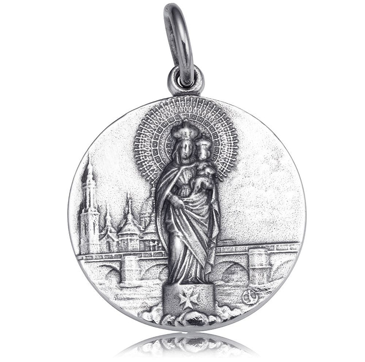 Medalla de plata 925 de la Virgen del Pilar y la Basílica del Pilar de fondo.