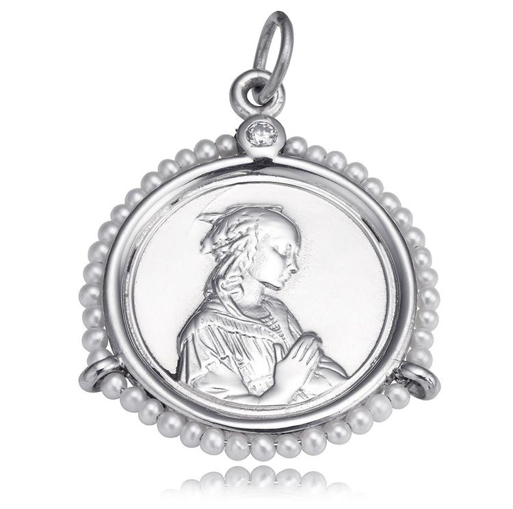 Medalla plata 925 de la Virgen de Lippi. Con orla de perlas de río alrededor y circonita blanca.