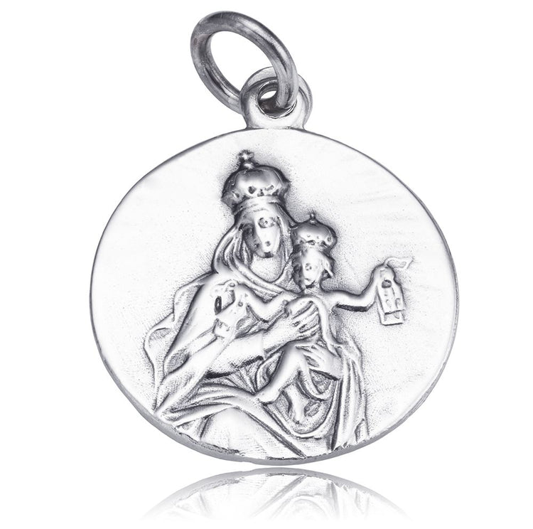 Medalla escapulario realizada en plata, dos caras, en una la Virgen del Carmen y en la otra el Sagrado Corazón de Jesús, con diámetro de 25 mm.