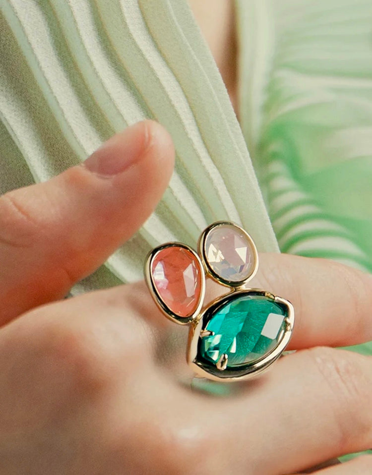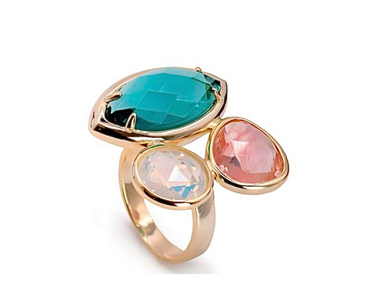 Anillo de plata dorada con 3 cuarzos de color irregulares