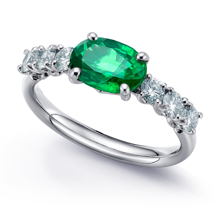 Anillo de oro blanco con una esmeralda oval tallada de 8,00 x 6,00 mm y 6 diamantes engastados en garras. Medida de dedo 5 1/2 (US) 11 (ESP)