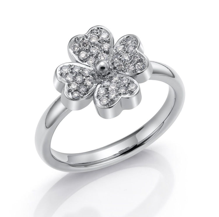 Anillo de Oro blanco con forma de trebol con diamantes talla brillante con peso total de 0,200 ct. Medida de dedo 5 1/2 (US) 10,5 (ESP)