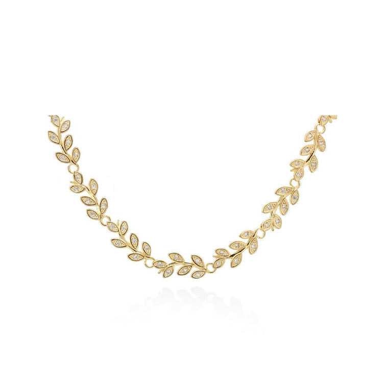 Gargantilla de plata de primera ley con baño de oro amarillo de 18K y hojas cuajadas de circonitas, se puede poner a diferentes medidas, también tipo choker.