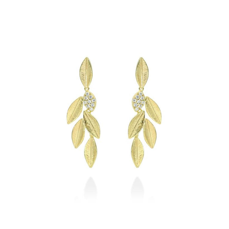 Pendientes de plata de Primera Ley y baño de oro amarillo de 18k con una de las hojas cuajada de circonitas blancas.