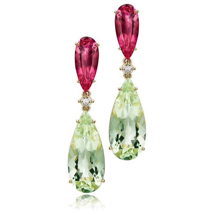 Pendientes de oro amarillo, peras de rubelitas de 13 x 6 mm y peras de prasiolitas de 20 x 9 mm y diamantes de 0,160ct