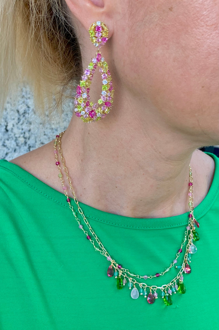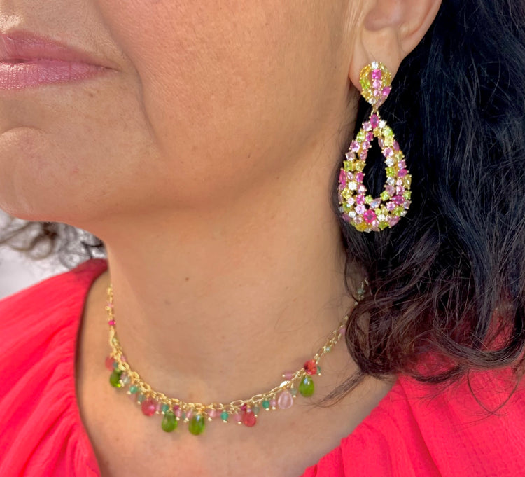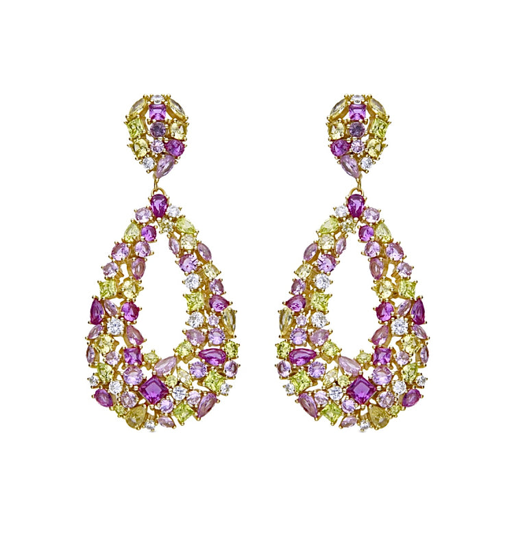 Pendientes vistosos largos cuajados enteros de circonitas de colores.