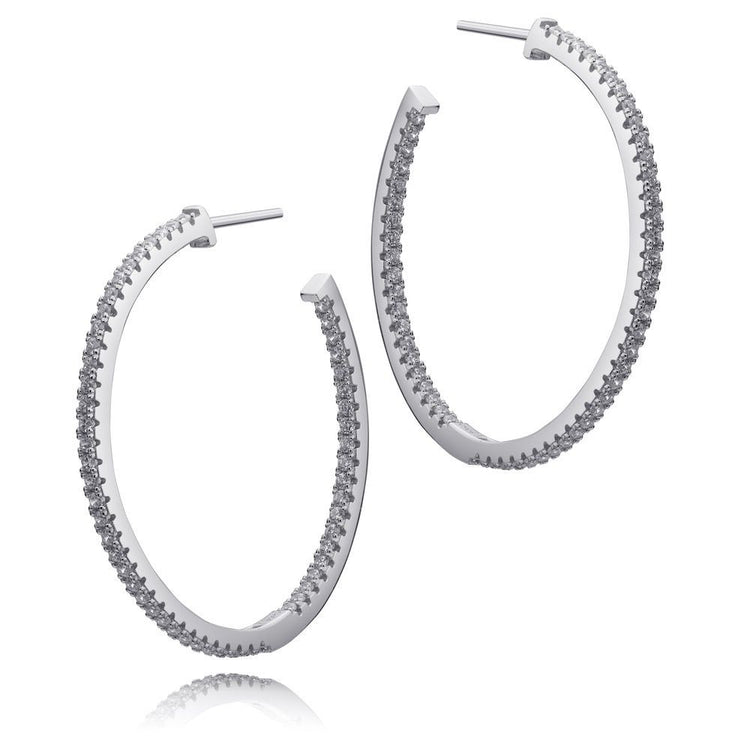 Pendientes de aro realizados en plata con circonitas. Las piedras se ven de manera frontal tanto las de fuera como las interiores y van engastadas en 4 garras. La medida es de 30 mm de Ø.