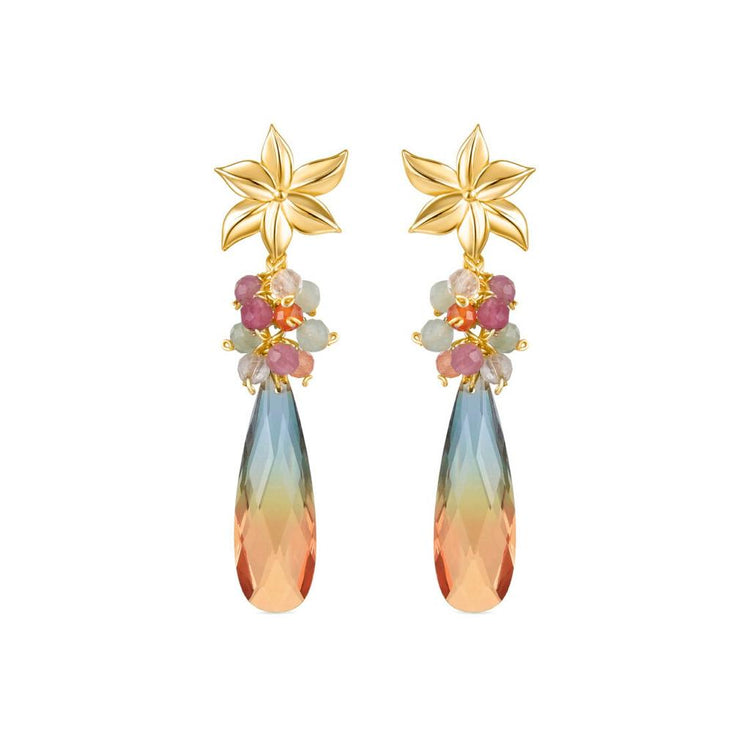 Pendientes de plata 925 con baño de oro amarillo 18K con flor, ramillete de Piedras multicolor y cuarzo hidrotermal multicolor al final.