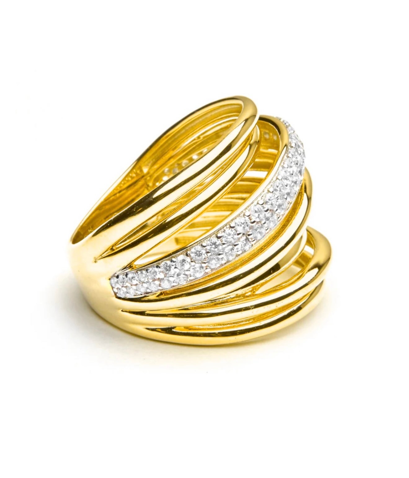 Anillo de plata925 con baño de oro amarillo de 18K con 7 brazos, uno de ellos con circonitas blancas.