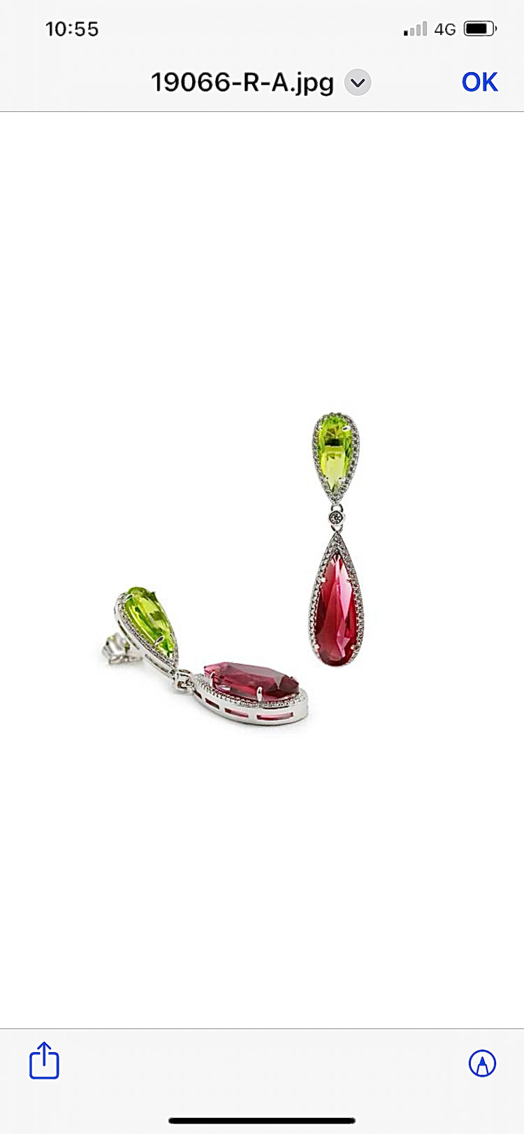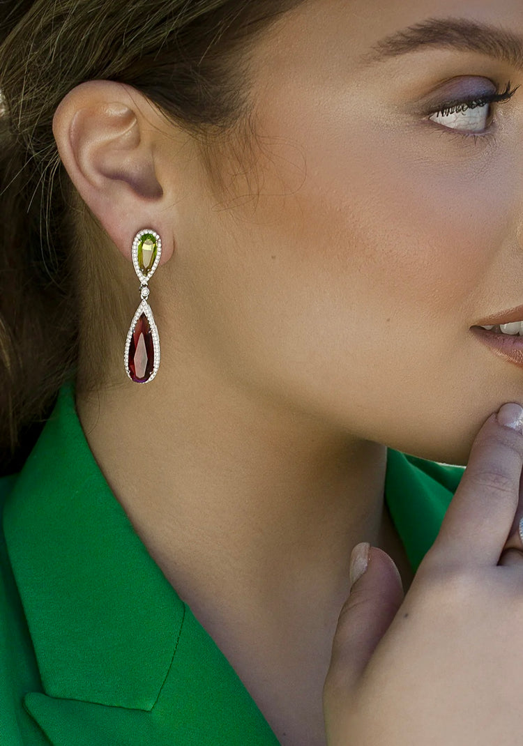 Pendientes largos elegantes , con piedras de color y circonitas blancas alrededor.