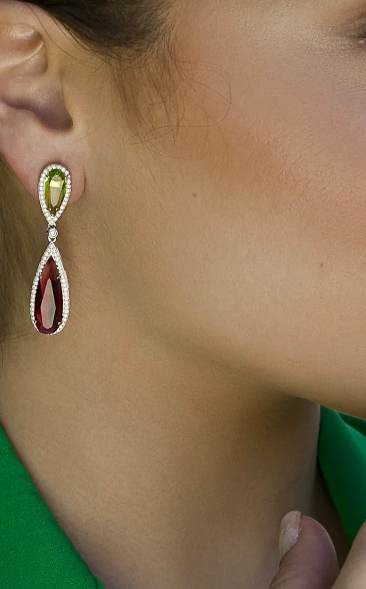 Pendientes largos elegantes , con piedras de color y circonitas blancas alrededor.