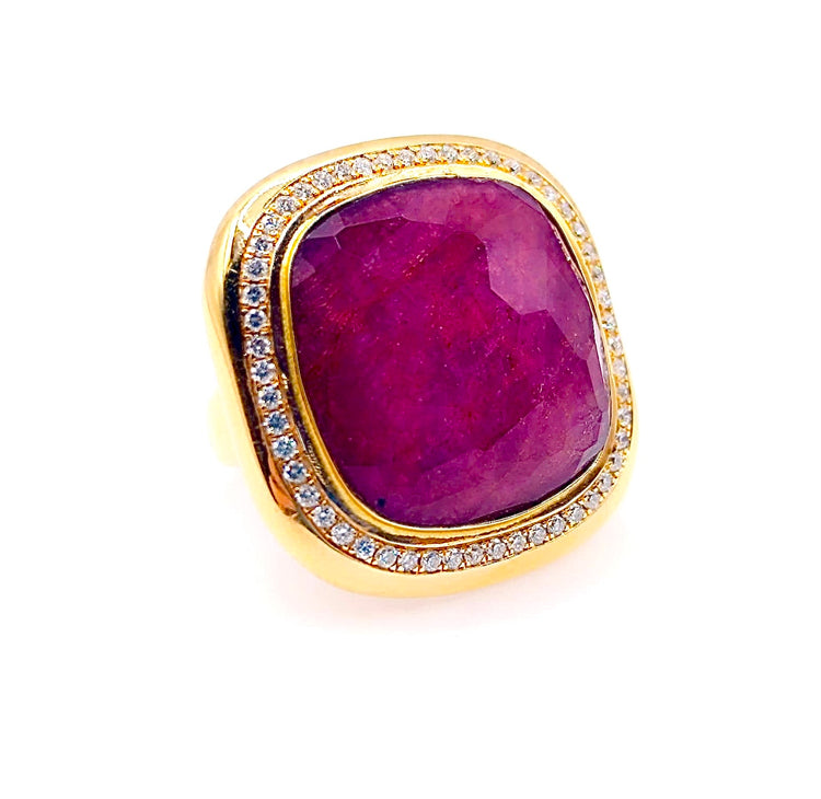 Anillo ancho de piedra cuadrada y orla de brillantes alrededor.