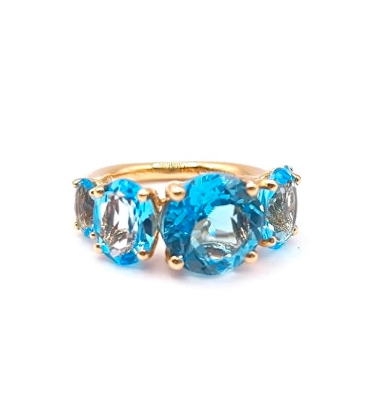 Anillo de Oro Rosa 18K con un topacio azul central y dos en disminución a cada lado del central. Con 5 diamantes de 0,08k en uno de los brazos del anillo.