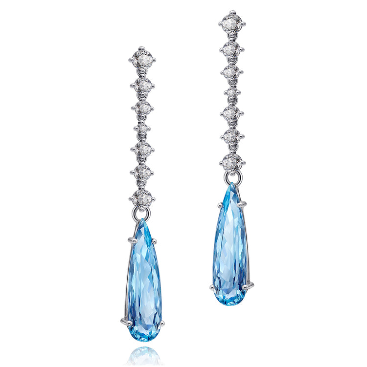 Long white gold earrings, brilliant cut diamonds with 1.34 ct. Si1H quality and aquamarine pears (7.50 ct.).