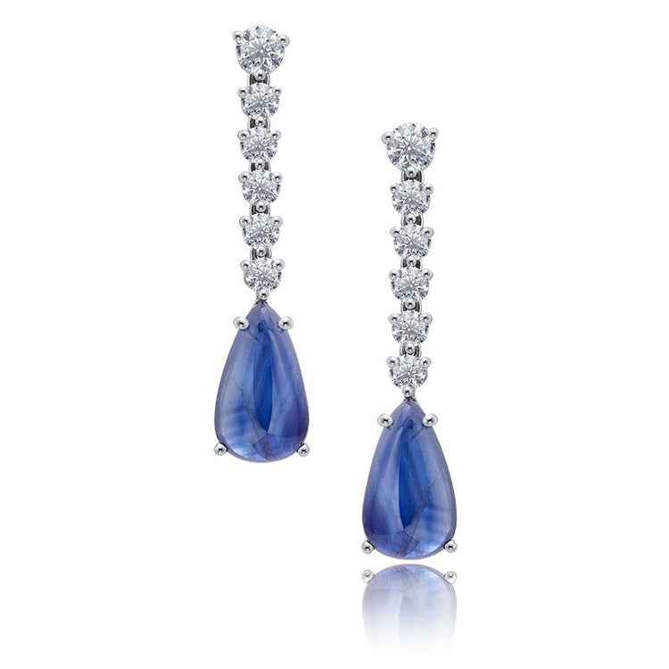 Pendientes de oro blanco, diamantes y peras de zafiros cabujón.
