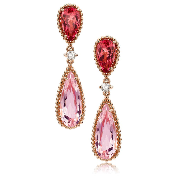 Pendientes de oro rojo de peso 5,300g y turmalinas en forma de pera tallada de 9x5mm y 0,700 g, diamante en el centro de 0,150ct en total y pera de morganita tallada de 1,5 ct en total.