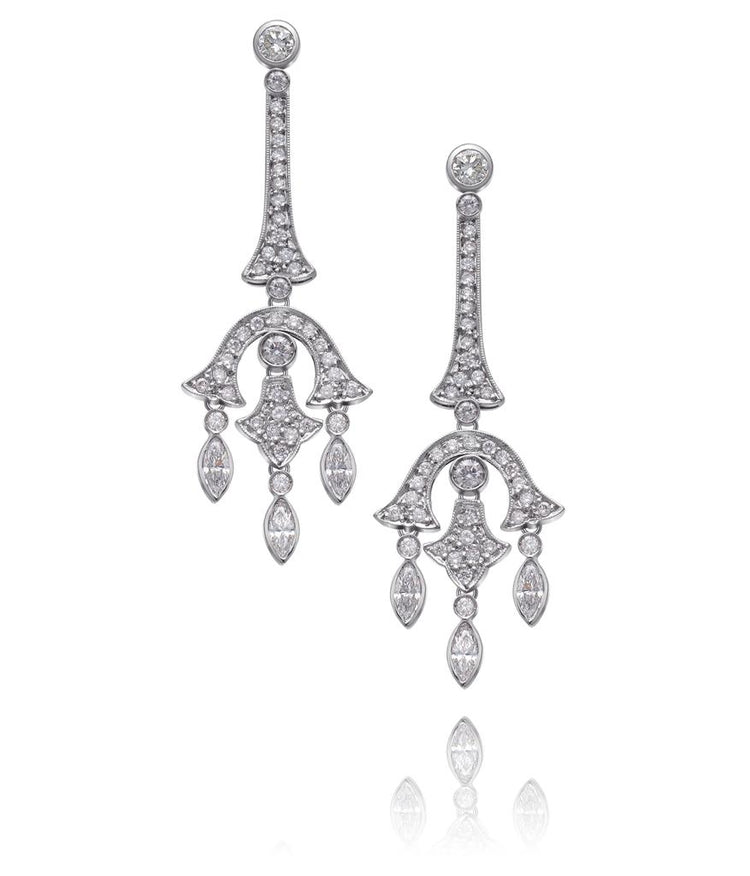 Pendientes de oro blanco y diamantes de 1.45ct en total. Con diamantes marquise en su terminación. Peso de oro: 9,100 g.