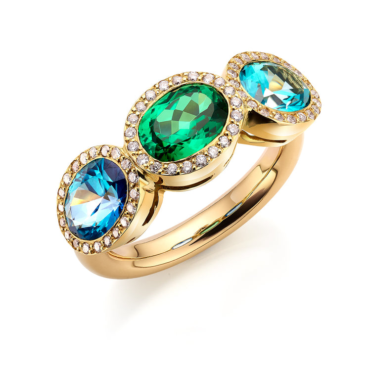 Yellow gold ring with 2 blue and 1 green topaz with 3 borders of diamonds around 0.38 ct. Finger size 8 (US) 17 (ESP)